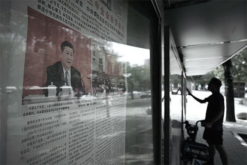 2024年7月19日,北京人行道上的展板展示有關三中全會閉幕的報紙報導。(Greg Baker / AFP via Getty Images)