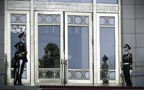三中全會後,關於中共黨魁出事的傳言層出不窮,顯示中共高層政治的動盪。圖為2024年4月,在北京人民大會堂外站崗的中共武警。(Pedro Pardo / AFP via Getty Images)