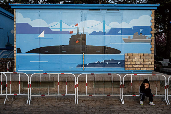 2024年4月20日青島西太平洋海軍論壇會議期間的中共海軍宣傳畫。(Kevin Frayer / Getty Images)