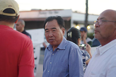 2016年10月,加州聖蓋博劇院,「紀念中國工農紅軍長征勝利80周年」紅歌會在抗議聲浪中上演,圖為組織紅歌會的陳軍。(劉菲/大紀元)