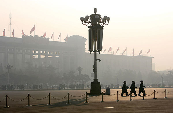 陳軍奉中共官員之命,在美國賣力迫害法輪功。如今,陳軍淪為罪犯了,有一位中共官員出面相救嗎?圖為2005年1月1日,中共警察在大霧期間在北京天安門廣場巡邏。(Cancan Chu / Getty Images)