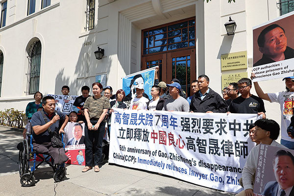 2024年8月13日,是高智晟律師被中共強制失蹤7周年。圖為8月10日高律師夫人耿和及正義人士在舊金山中領館前集會抗議。(煙雨/大紀元)