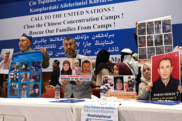 索博利克敦促政策制定者嚴厲打擊新疆發生的酷刑、洗腦、強制絕育等殘酷迫害。圖為2022年5月10日,新疆維吾爾少數民族成員展示他們在中國被拘留的親屬的照片。(Ozan Kose/AFP via Getty Images)
